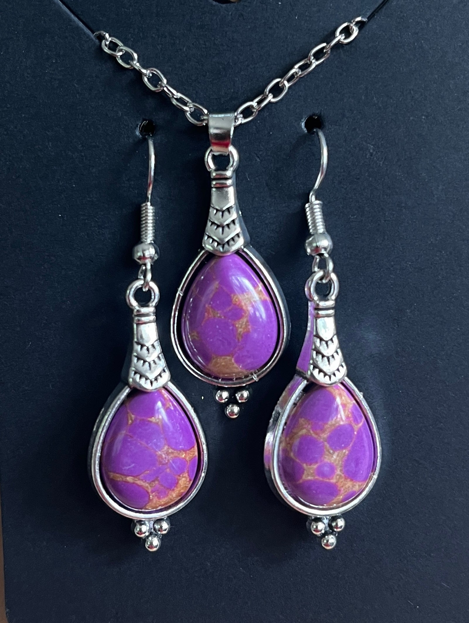 Fashion Jewellery: Natural purple coloured teardrop shaped stone pendant inlaid in zinc alloy and silver coloured zinc alloy necklace with matching earrings .